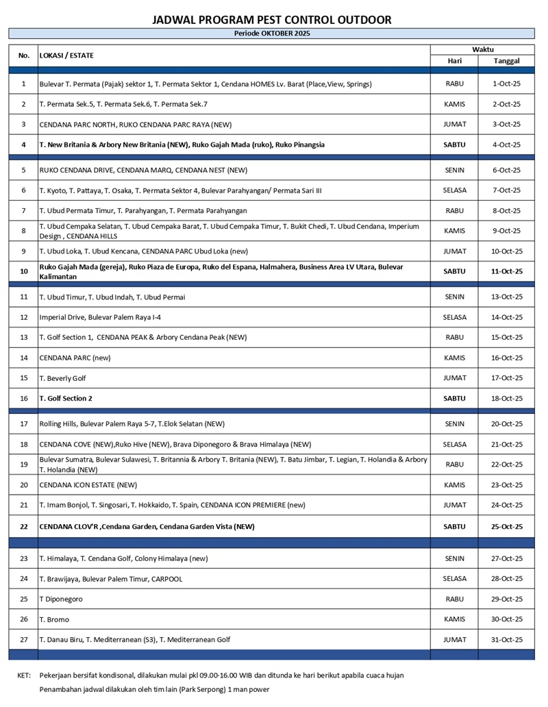 Pembersihan pipa akan dilakukan mulai pkl 10.00 sd 16.00 WIB, dengan jadwal sebagai berikut: